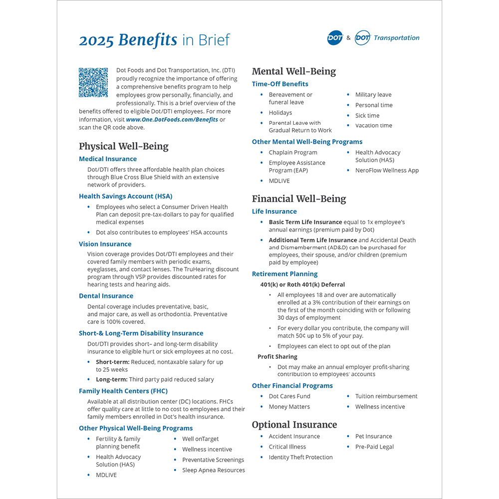 This one-page guide sheet contains the 2025 Dot and DTI Benefits-in-Brief, available in English, Spanish, and French versions.