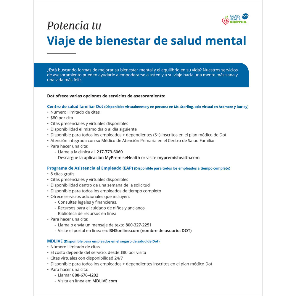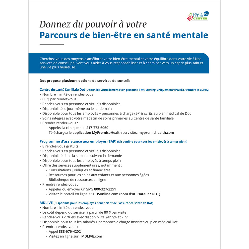 One page flyer promoting behavioral health counseling services. Available in English, Spanish, and French.