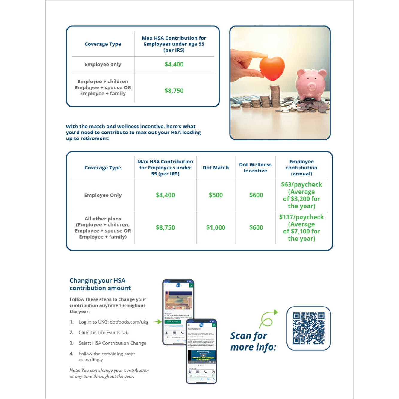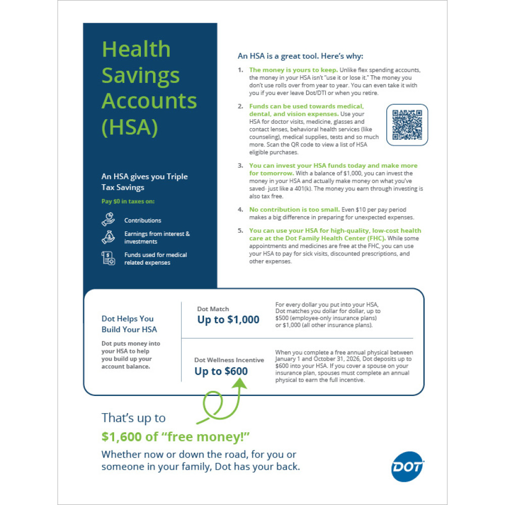Two-page flyer promoting Dot’s Health Savings Account (HSA) benefits.